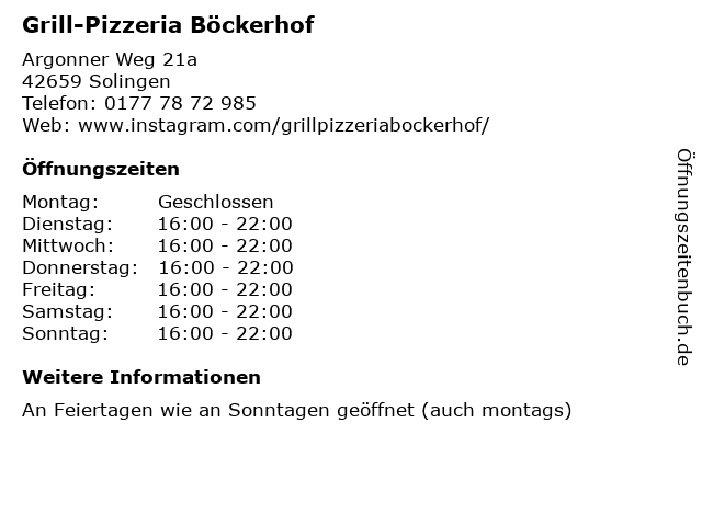| Öffnungszeiten Grill-Pizzeria Böckerhof in Solingen anzeigen | |