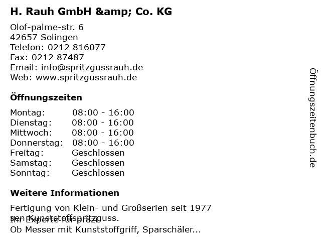 | Öffnungszeiten H. Rauh GmbH & Co. KG in Solingen anzeigen | |