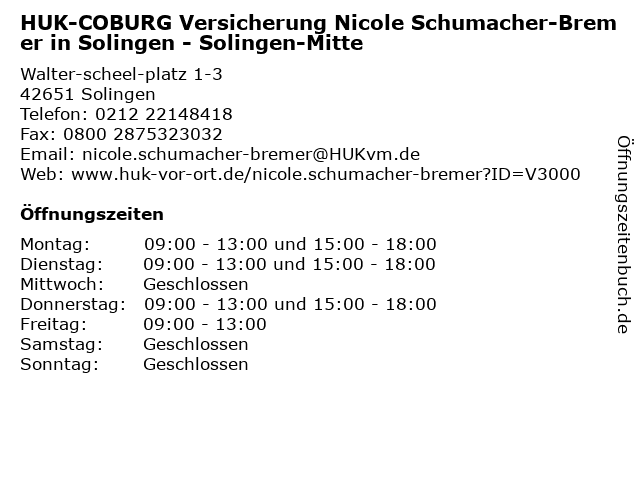 Branchen & Suchbegriffe zu HUK-COBURG Versicherung Nicole Schumacher-Bremer in Solingen - Solingen-Mitte:altersvorsorge, autoversicherung, berufsunfähigkeitsversicherung, bremer, coburg, gebäude- und hausratsversicherung, huk, kfz-versicherung (motorrad), mitte, nicole, schumacher, tierversicherung, versicherung, zahnmedizinische versicherung |
