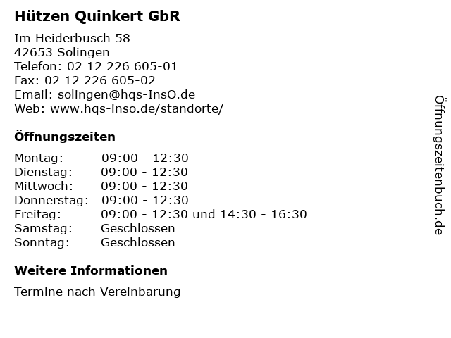 | Öffnungszeiten Hützen Quinkert GbR in Solingen anzeigen | |
