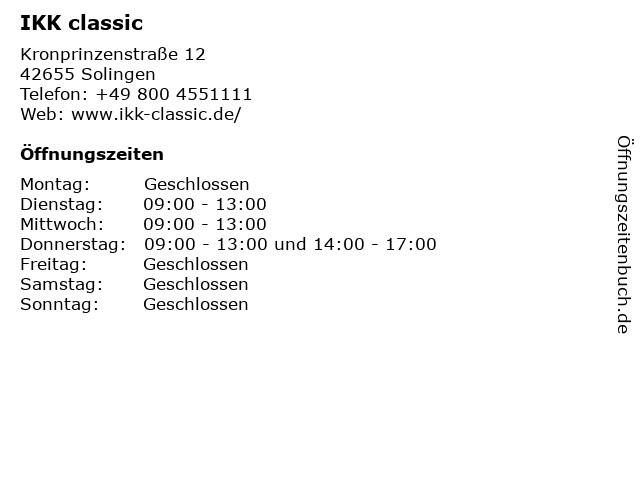 | Öffnungszeiten IKK classic in Solingen anzeigen | |