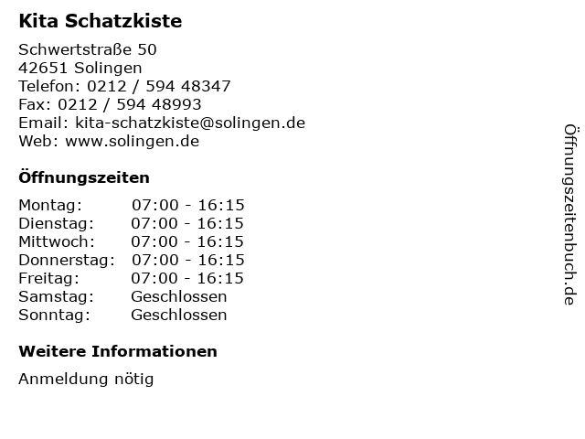 | Öffnungszeiten Kita Schatzkiste in Solingen anzeigen | |