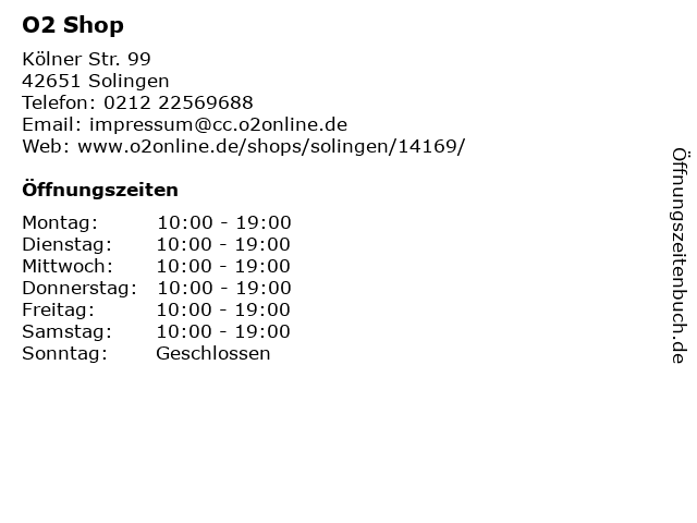 | Öffnungszeiten O2 Shop in Solingen anzeigen | |