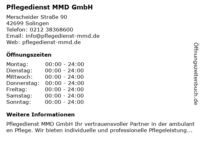 Öffnungszeiten Pflegedienst MMD GmbH in Solingen anzeigen | |