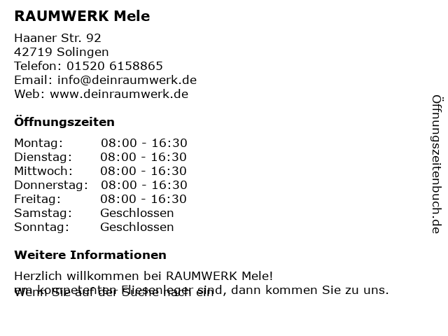 Öffnungszeiten RAUMWERK Mele in Solingen anzeigen | |