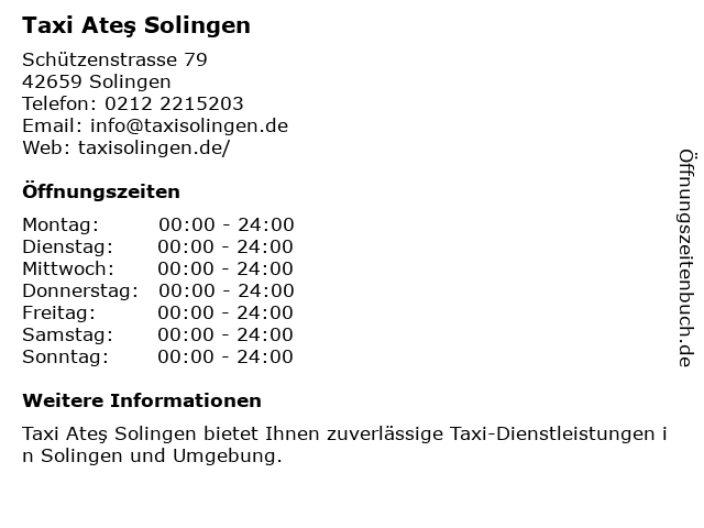 | Öffnungszeiten Taxi Ateş Solingen in Solingen anzeigen | |