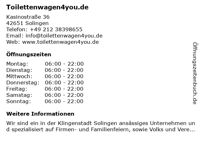 | Öffnungszeiten Toilettenwagen4you.de in Solingen anzeigen | |