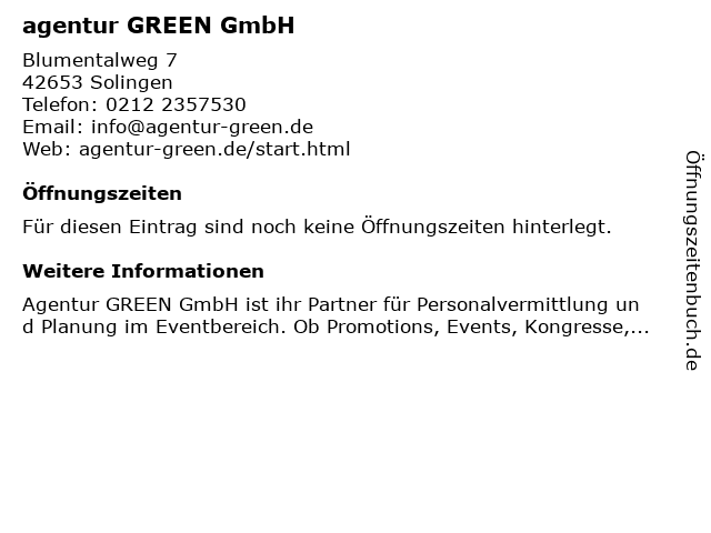 | Öffnungszeiten agentur GREEN GmbH in Solingen anzeigen | |