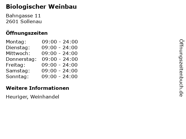 | Öffnungszeiten Biologischer Weinbau in Sollenau anzeigen | |