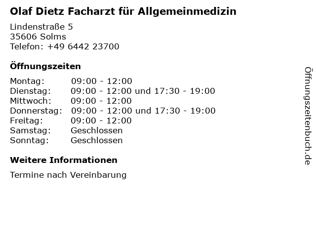 3 Dietz -Karl-Heinz Allgemeinarzt (Allgemeinarzter) (Entfernung: 1,99 km) Wetzlarer Strasse 24, 35606 Solms 6 |