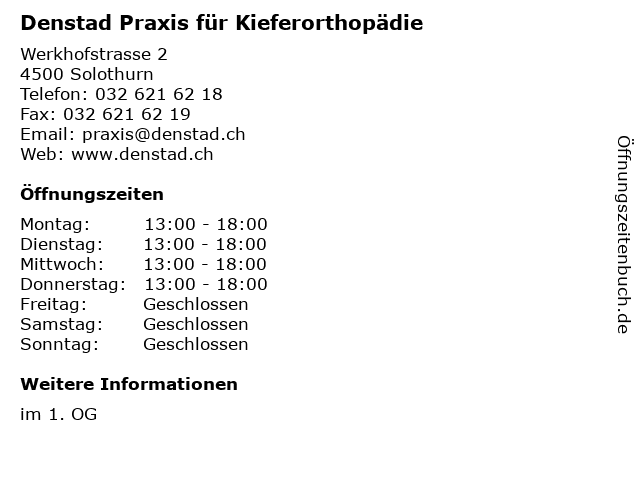1 Dr. med. dent. Jan Danz - Fachzahnarzt für Kieferorthopädie (Entfernung: 0,36 km) Löwengasse 1 1, 4500 Solothurn 2 Dr. med. dent. Bruce Stocker - Fachpraxis für Kieferorthopädie (Entfernung: 1,19 km) Zuchwilerstrasse 64, 4500 Solothurn 3 perfectsmile - Praxis für Kieferorthopädie - Dr. med. dent. Regula Schmuckli & Team (Entfernung: 10,55 km) Kirchstrasse 1, 2540 Grenchen 4 Dr. med. dent Ivo Ferrarini - Fachzahnarzt für Kieferorthopädie (Entfernung: 16,62 km) Bienkenstrasse 22, 4702 Oensingen 5 Fachzahnärzte für Kieferorthopädie - Dres. J.-M. Grossen und Anu Kaipainen (Entfernung: 19,01 km) Eisenbahnstrasse 9, 4900 Langenthal 6 |