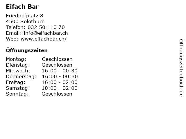 | Öffnungszeiten Eifach Bar in Solothurn anzeigen | |