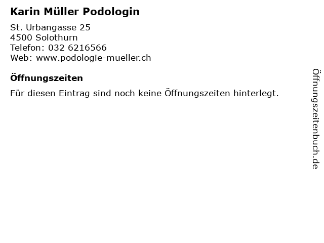 | Öffnungszeiten Karin Müller Podologin in Solothurn anzeigen | |