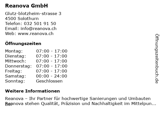 | Öffnungszeiten Reanova GmbH in Solothurn anzeigen | |
