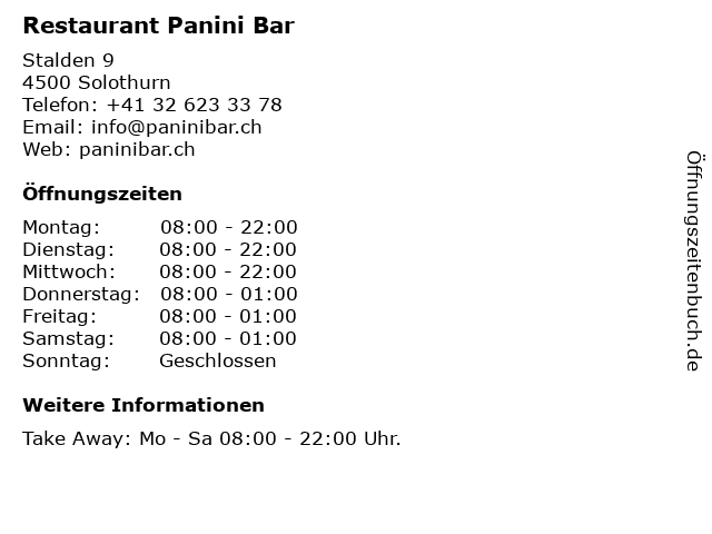 | Öffnungszeiten Restaurant Panini Bar in Solothurn anzeigen | |