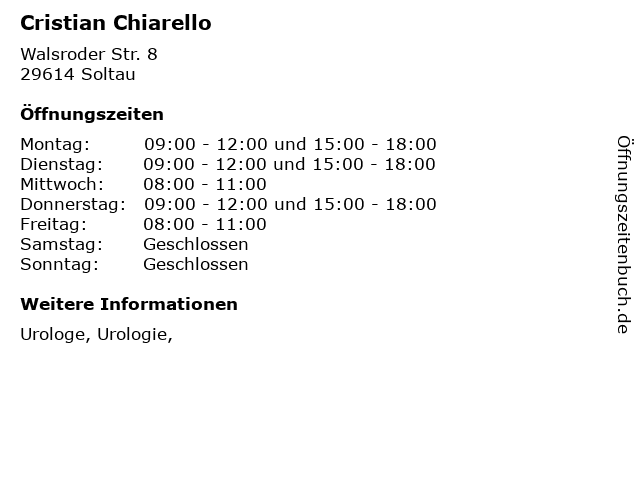 | Öffnungszeiten Cristian Chiarello in Soltau anzeigen | |