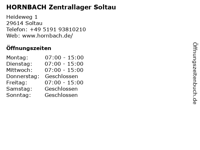 | Öffnungszeiten HORNBACH Zentrallager Soltau in Soltau anzeigen | |