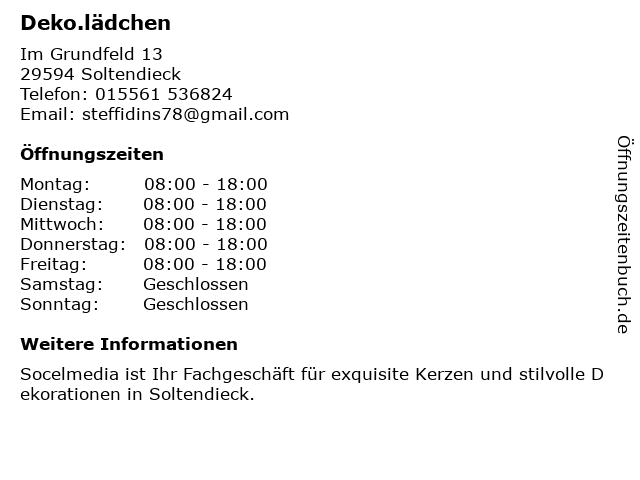 | Öffnungszeiten Deko.lädchen in Soltendieck anzeigen | |