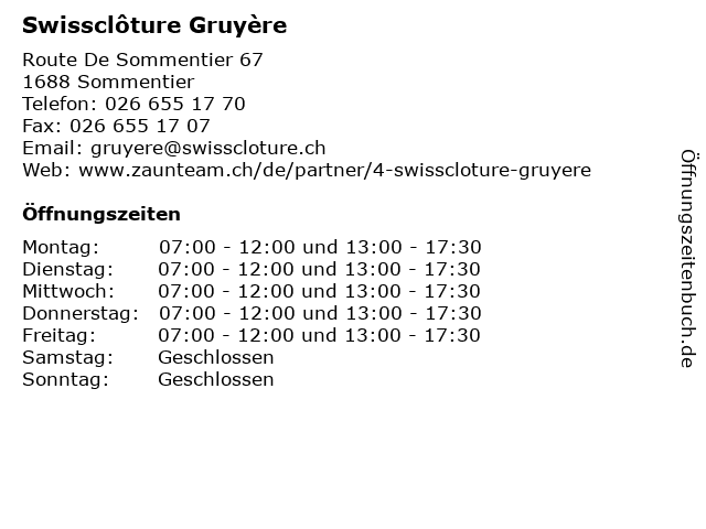 Öffnungszeiten Swissclôture Gruyère in Sommentier anzeigen | |