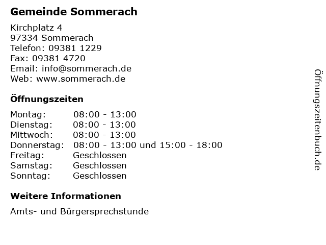 | Öffnungszeiten Gemeinde Sommerach in Sommerach anzeigen | |