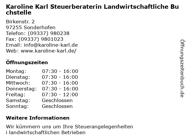 1 Steuerbüro Martin Deppisch Landwirtschaftliche Buchstelle (Entfernung: 6,44 km) Bachgasse 18, 97244 Bütthard 3 Dipl. Psychologin Karoline Sahlmüller - Psychologische Beratung, Heilpraktikerin für Psychotherapie und Gesundheitscoaching (Entfernung: 14,12 km) Am Schloß 2, 97084 Würzburg 6 Bernhard Bayer & Walburga Sonntag Steuerberater Landwirtschaftliche Buchstelle (Entfernung: 17,73 km) Margeritenstraße 6, 97950 Großrinderfeld |