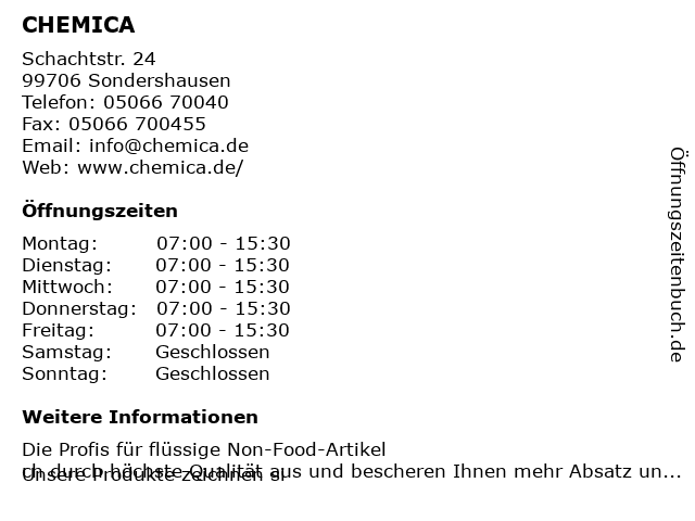 | Öffnungszeiten CHEMICA in Sondershausen anzeigen | |