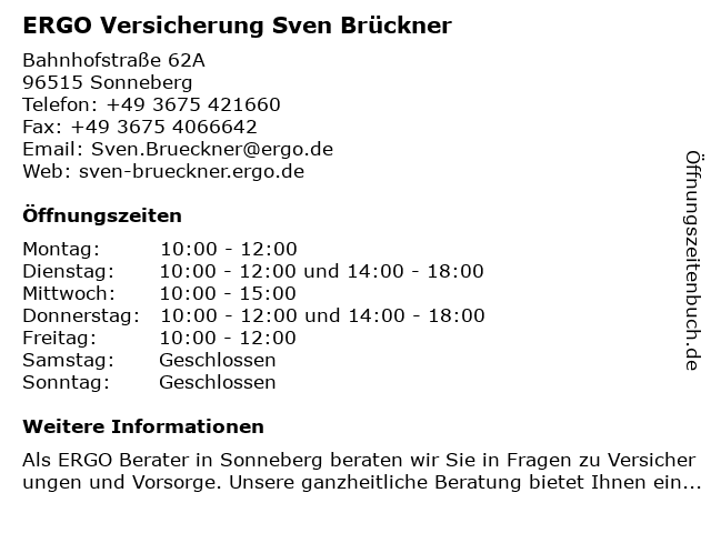 2 Sandras Haarwelt Inh. Sandra Brückner (Entfernung: 0,80 km) Friedrich-Ludwig-Jahn-Str. 31, 96515 Sonneberg 5 ERGO Versicherung Sascha Reichenbacher (Entfernung: 1,42 km) Köppelsdorfer Straße 119a, 96515 Sonneberg 6 |