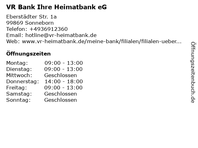 | Öffnungszeiten VR Bank Ihre Heimatbank eG in Sonneborn anzeigen | |