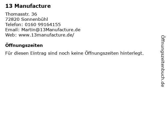 | Öffnungszeiten 13 Manufacture in Sonnenbühl anzeigen | |