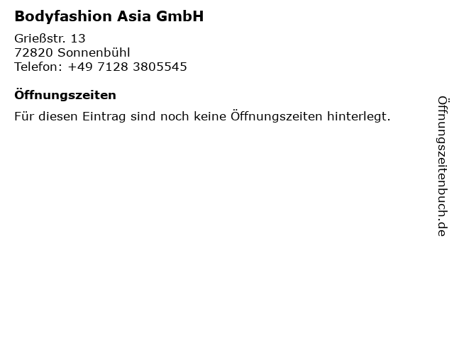 | Öffnungszeiten Bodyfashion Asia GmbH in Sonnenbühl anzeigen | |