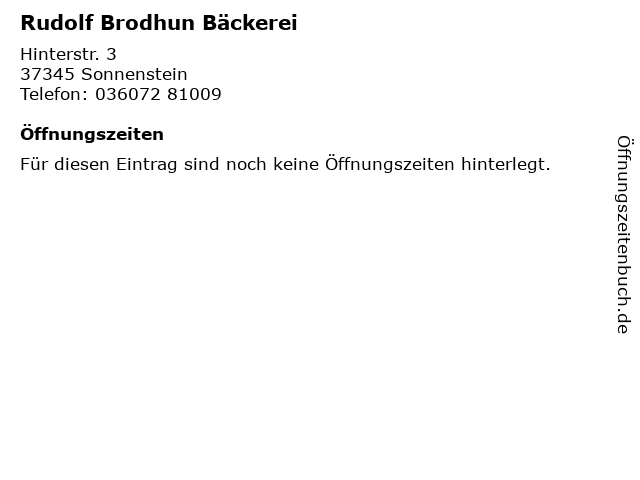 | Öffnungszeiten Rudolf Brodhun Bäckerei in Sonnenstein anzeigen | |