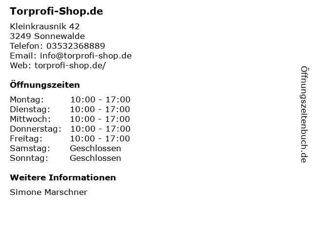 | Öffnungszeiten Torprofi-Shop.de in Sonnewalde anzeigen | |