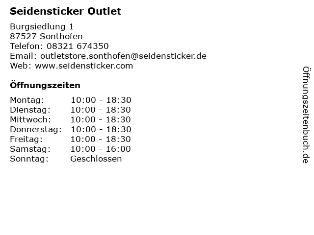 | Öffnungszeiten Seidensticker Outlet in Sonthofen anzeigen | |