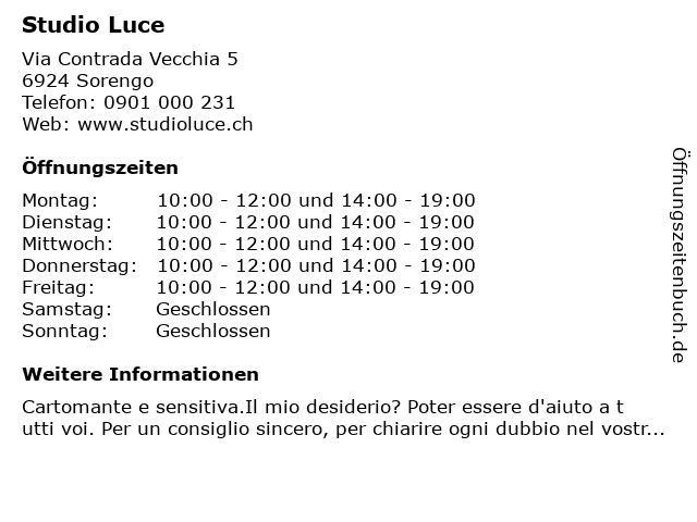 | Öffnungszeiten Studio Luce in Sorengo anzeigen | |
