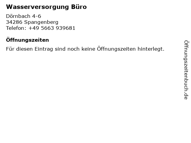 | Öffnungszeiten Wasserversorgung Büro in Spangenberg anzeigen | |