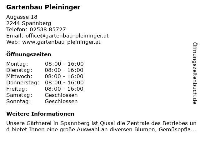 | Öffnungszeiten Gartenbau Pleininger in Spannberg anzeigen | |
