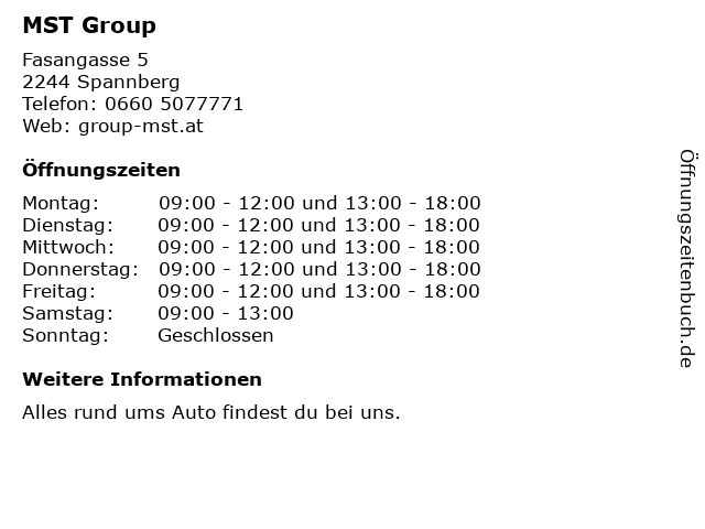 | Öffnungszeiten MST Group in Spannberg anzeigen | |