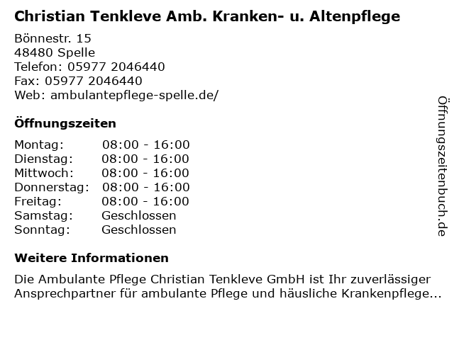 2 Ambulante Kranken- & Altenpflege Christian Tenkleve (Entfernung: 0,07 km) Speller Str. 19, 48480 Spelle 3 Caritas Bildungswerk Ahaus GmbH Fachseminar für Altenpflege Altenpflegeschule (Entfernung: 11,43 km) Devesburgstr. 6, 48431 Rheine 4 Taxi Rheine.de zwanzig-vierzig | Kranken- und Dialysefahrten (Entfernung: 12,85 km) Landersumer Weg 40, 48431 Rheine 5 Titus Kranken- u. Intensivpflege GmbH & Co.KG (Entfernung: 19,85 km) Neuenkirchener Str. 23, 49509 Recke 6 |