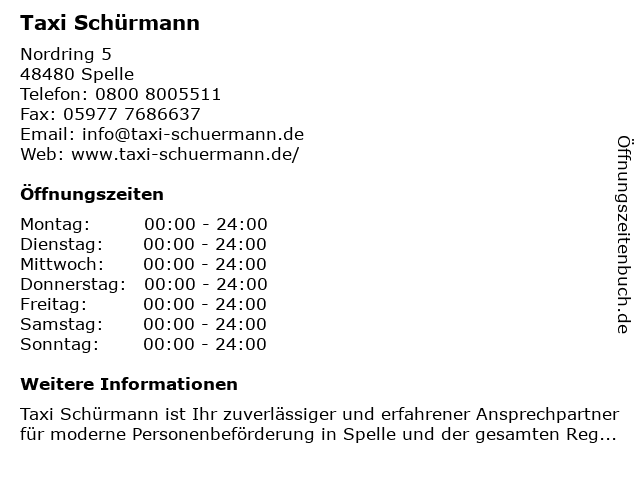 | Öffnungszeiten Taxi Schürmann in Spelle anzeigen | |