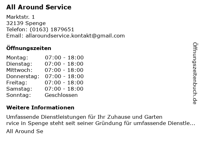 | Öffnungszeiten All Around Service in Spenge anzeigen | |