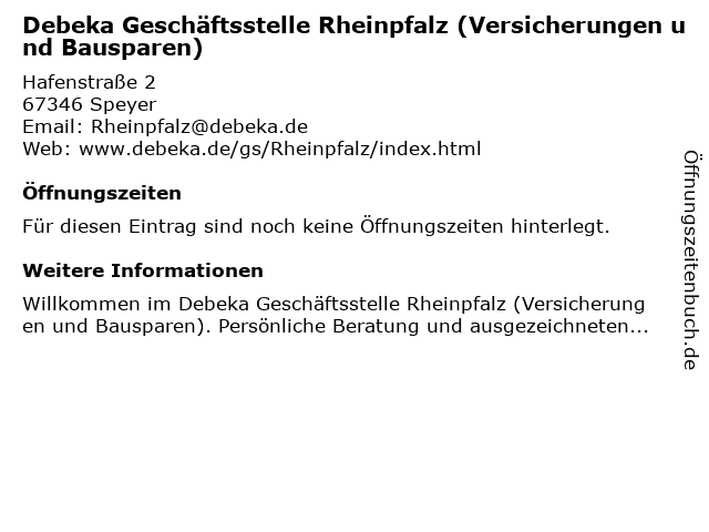 | Öffnungszeiten Debeka Geschäftsstelle Rheinpfalz (Versicherungen und Bausparen) in Speyer anzeigen | |