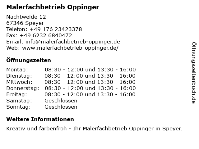 | Öffnungszeiten Malerfachbetrieb Oppinger in Speyer anzeigen | |