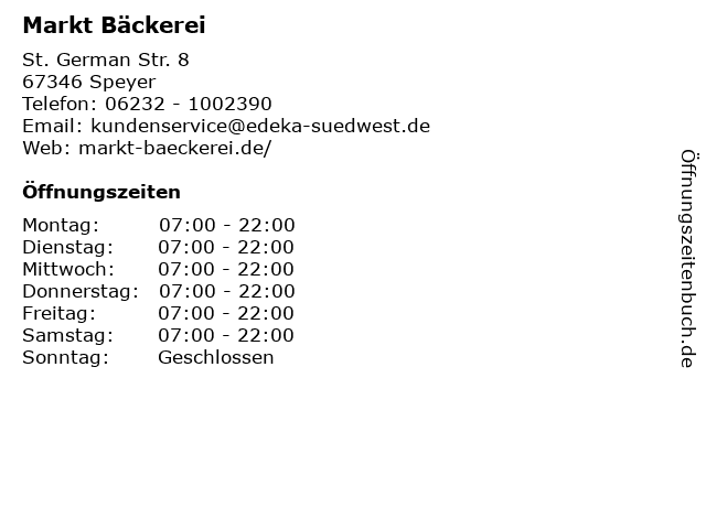 | Öffnungszeiten Markt Bäckerei in Speyer anzeigen | |