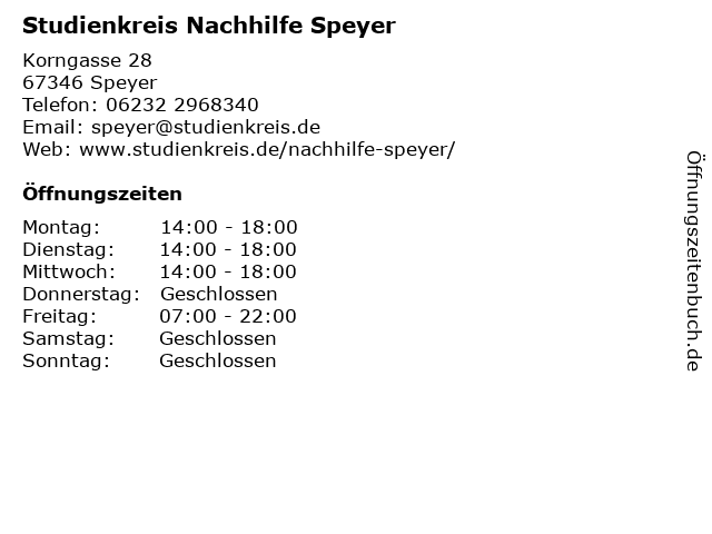 | Öffnungszeiten Studienkreis Nachhilfe Speyer in Speyer anzeigen | |