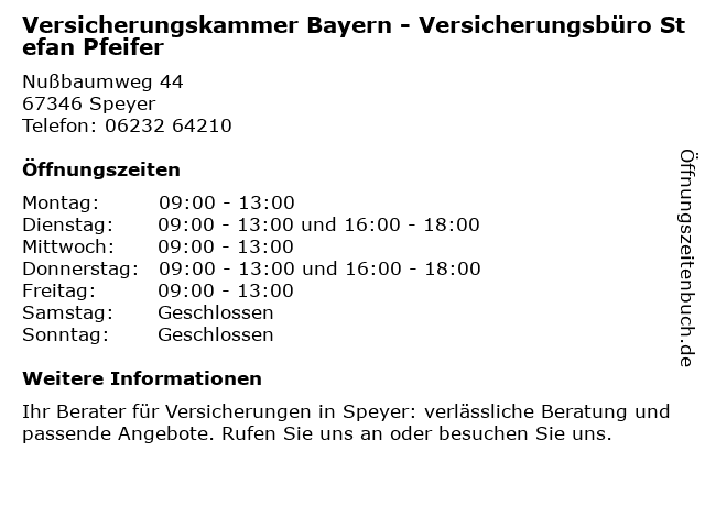 1 Versicherungskammer Bayern - Versicherungsbüro Marcel Müller (Entfernung: 0,01 km) Nußbaumweg 44, 67346 Speyer 2 Bayerische Versicherungskammer - Versicherungsberatung der Versicherungsdienste ppa GmbH (Entfernung: 2,39 km) Fünfkirchener Weg 3, 67346 Speyer 4 Versicherungskammer Bayern - Versicherungsagentur Michael Hack (Entfernung: 3,18 km) Fischmarkt 2, 67346 Speyer 5 Versicherungskammer Bayern - Versicherungsbüro Mark Fischer (Entfernung: 3,29 km) Mühlturmstr. 18, 67346 Speyer 6 Bayerische Versicherungskammer - Agentur Ralf Bähr (Entfernung: 4,94 km) Salierstr . 66, 67105 Schifferstadt |