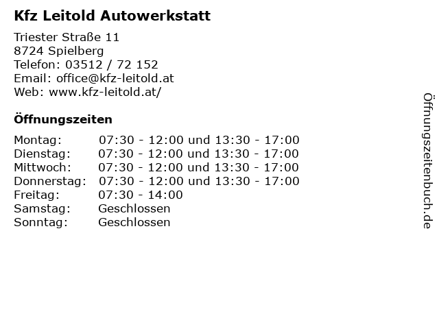 | Öffnungszeiten Kfz Leitold Autowerkstatt in Spielberg anzeigen | |