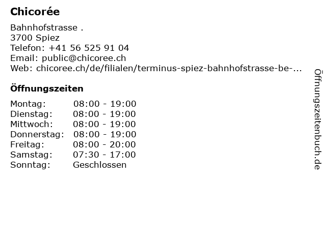 | Öffnungszeiten Chicorée in Spiez anzeigen | |