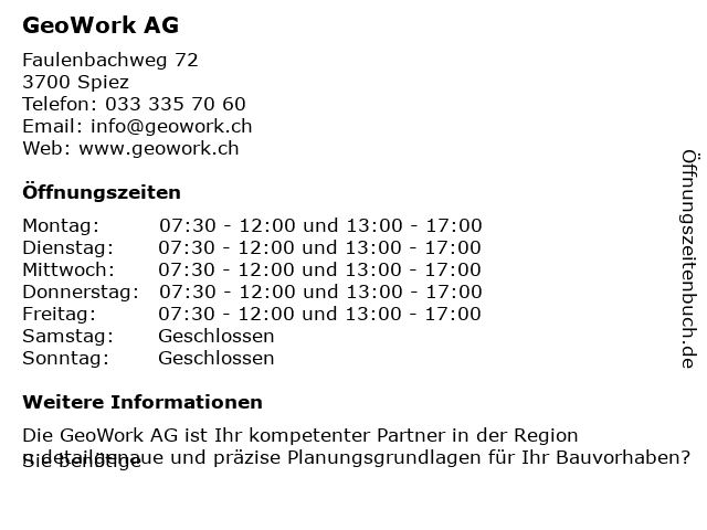 | Öffnungszeiten GeoWork AG in Spiez anzeigen | |