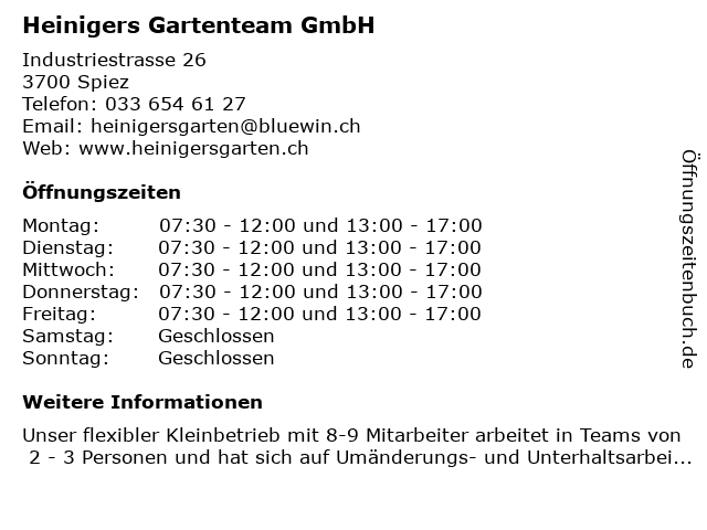 | Öffnungszeiten Heinigers Gartenteam GmbH in Spiez anzeigen | |
