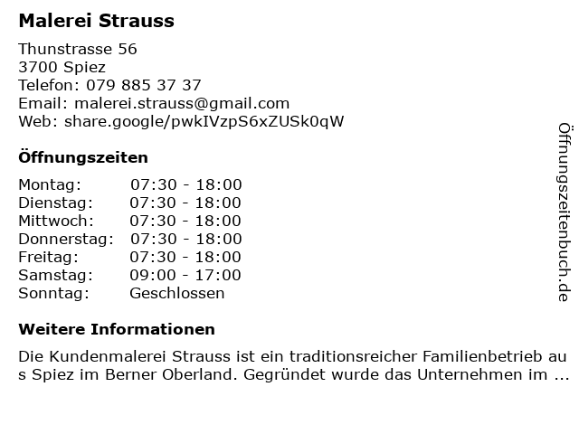 | Öffnungszeiten Malerei Strauss in Spiez anzeigen | |